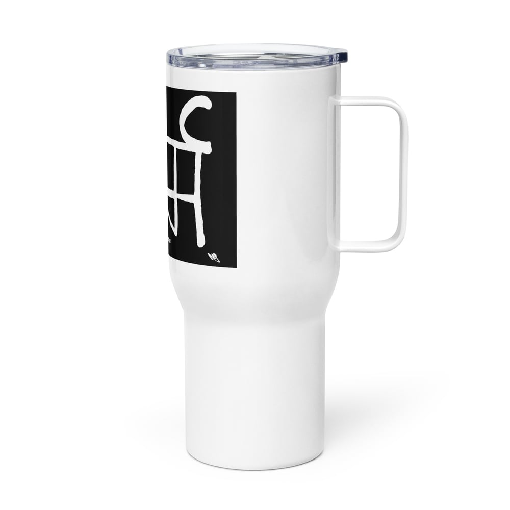 Karma Sanskrit travel mug with a handle